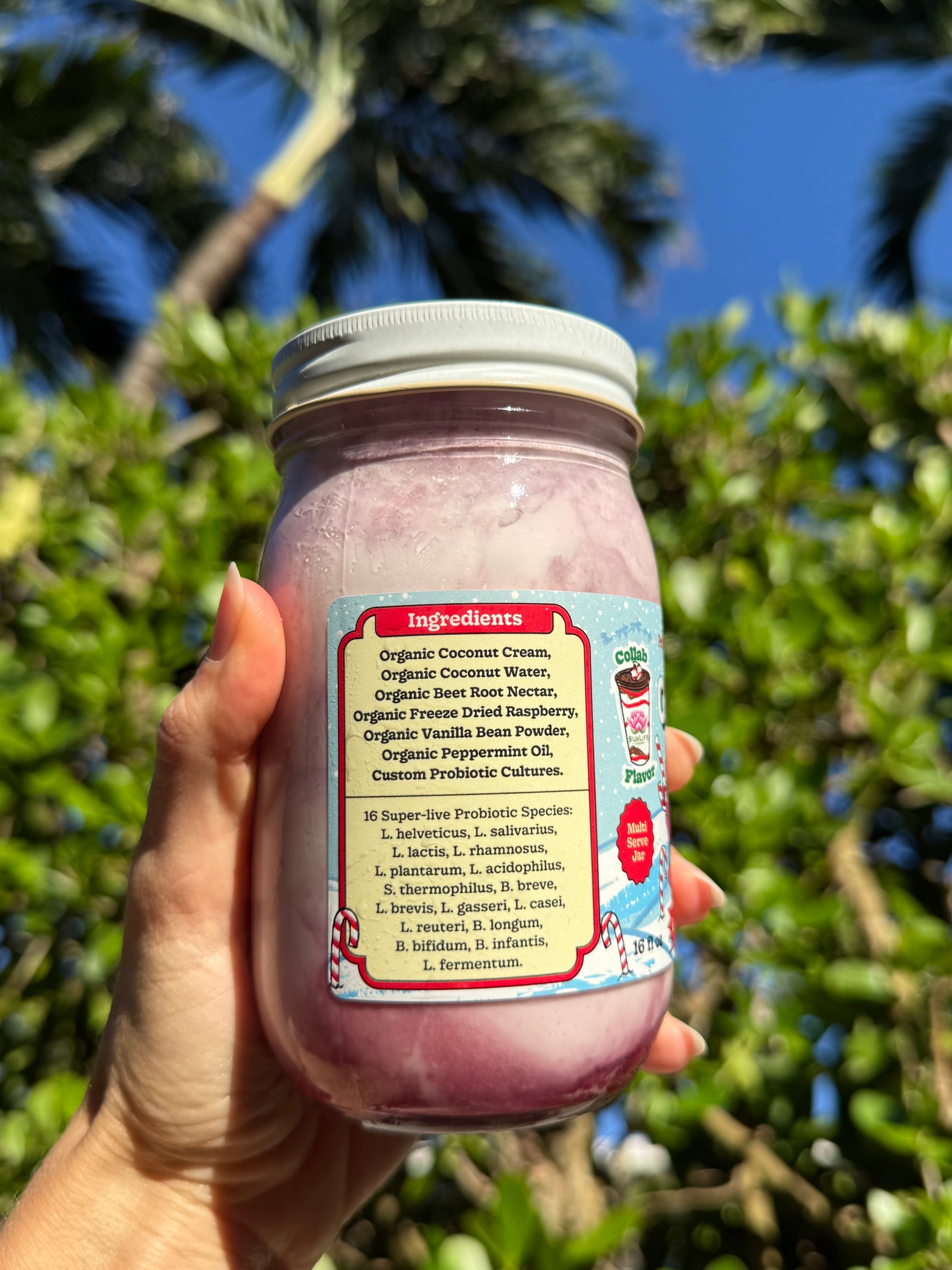 Organic Coconut Cream, Organic Coconut Water, Organic Beet Root Nectar, Organic Freeze Dried Raspberry, Organic Vanilla Bean Powder, Organic Peppermint Oil, Custom Probiotic Cultures.