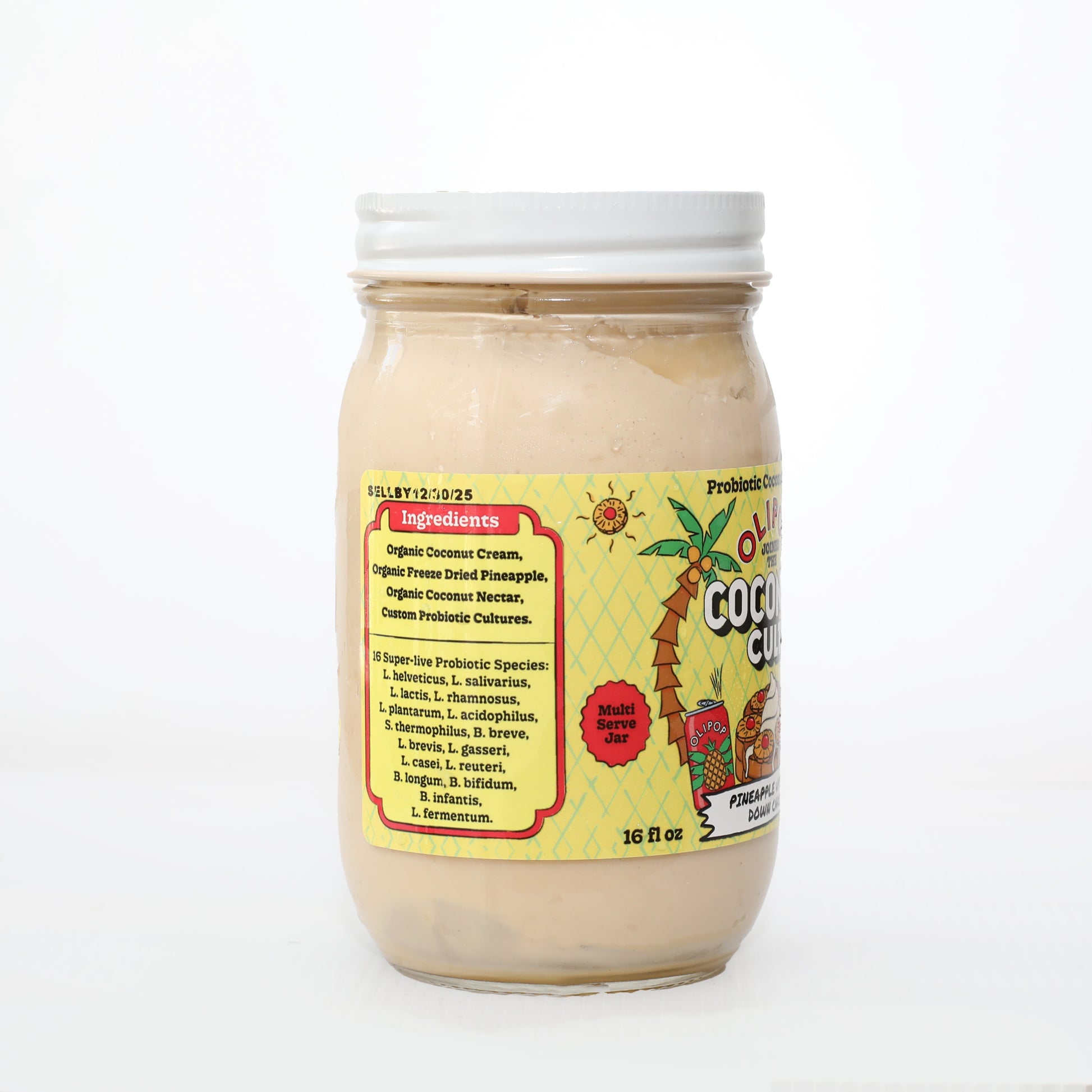 Organic Coconut Cream, Organic Freeze Dried Pineapple, Organic Coconut Nectar, Custom Probiotic Cultures.